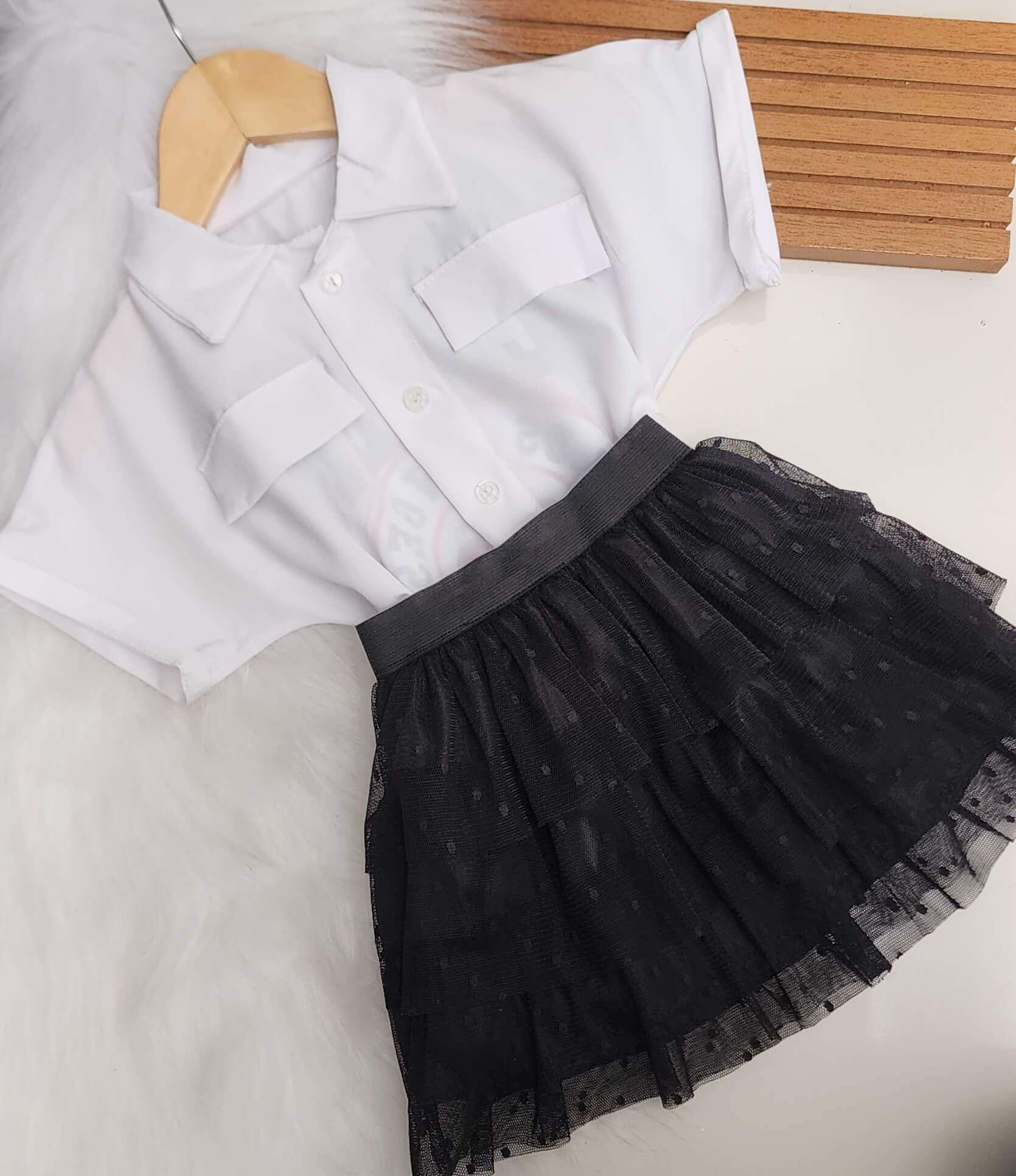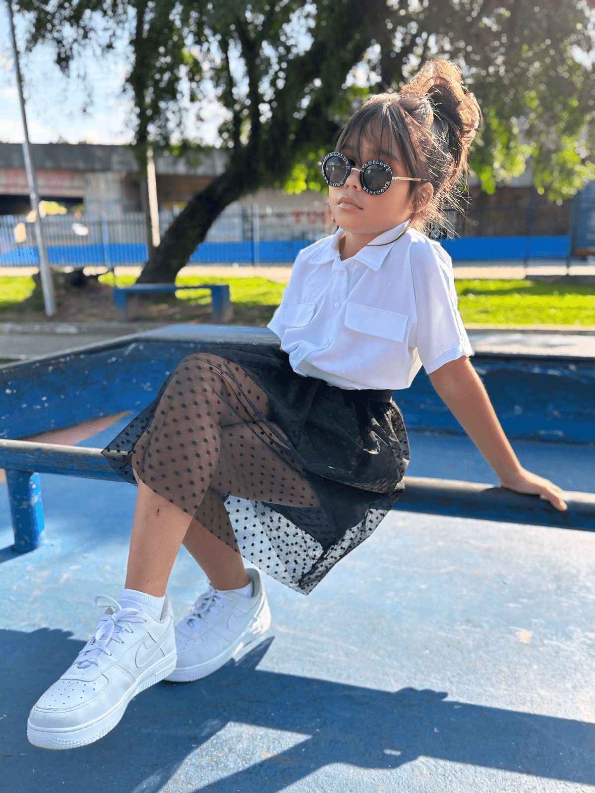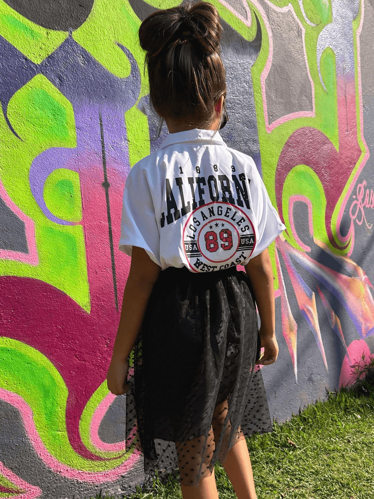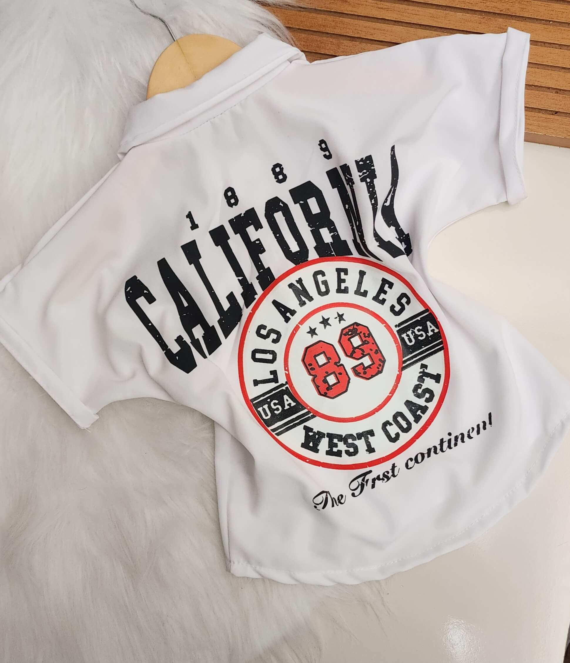 Camisa estilo over sized, estampada los angeles nas costas com bolsos falso na frente . Confeccionada no tecido crepinho.