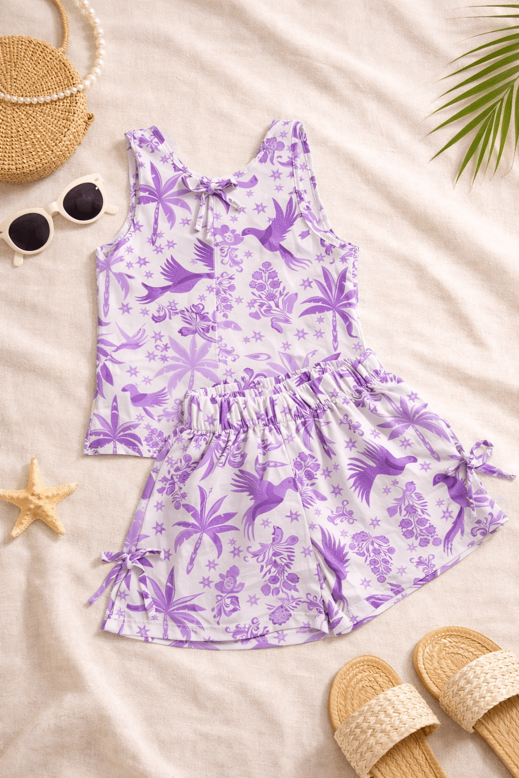 Conjunto composto por blusa regata com fechamento em laços nas costas e short com laços lateral.